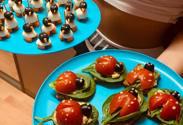 - Pomocou špáradla a nátierky z hummusu dorobte na záver oči a bodky.