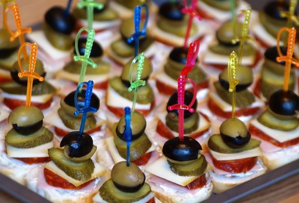 - Rožky potrite nátierkou. Teraz na ne navŕšte plátok šunky, plátok klobásy, plátok syra, koliesko z kyslej uhorky a na koniec polovicu olivy. Aby vám to držalo pohromade, použite špáradlo.