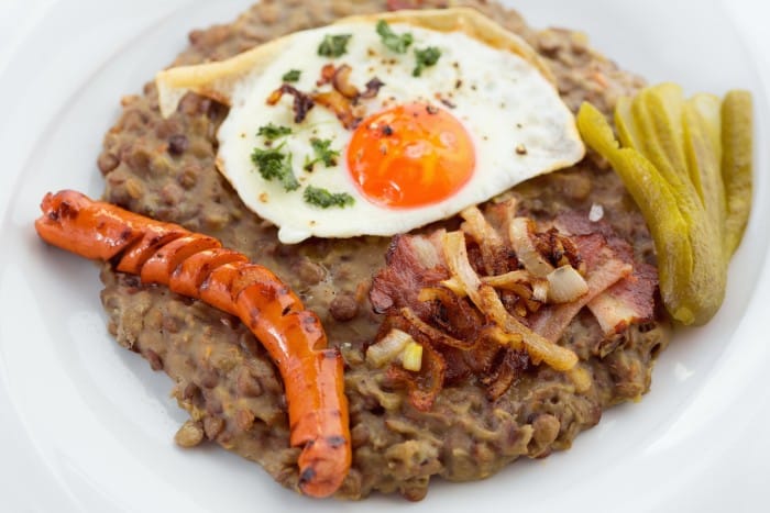 Pokiaľ si nie ste istí, s čím šošovicu najlepšie podávať, potom vedzte, že najlepšou kombináciou je bravčové mäso. Predovšetkým prasačí rypáčik alebo celé prasiatko vám totiž prinesie v novom roku bohatstvo a šťastie. Ale ani vajíčkom, napríklad v podobe volského oka, nič nepokazíte. Vajcia sú všeobecne symbolom nového života.
