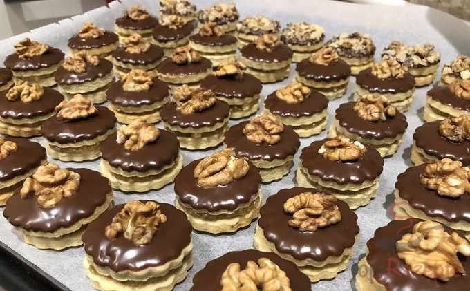- Vychladnuté kolieska k sebe zlepujte náplňou a polejte polevou. Navrch dajte oriešok a nechajte zatuhnúť v chladničke. Skladujte v chlade.