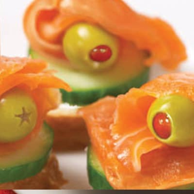 - Na uhorku dajte jednu olivu obalenú lososom.