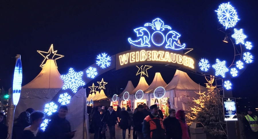 Pozdĺž bulváru Jungfernstieg pri Binnenalsteri nájdete ďalší krásny hamburský vianočný trh, ktorý je známy svojou elegantnou bielou farbou a strieborno-zlatou hrou svetiel.
