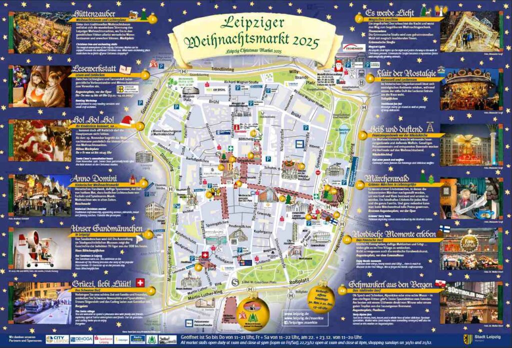 Hlavným priestorom trhu je tradične Marktplatz, kde sa nachádza obrovský vianočný strom a taktiež sa tu konajú najrôznejšie vystúpenia. Na námestí Augustusplatz je lákadlom 38 metrov vysoký ruský bicykel.