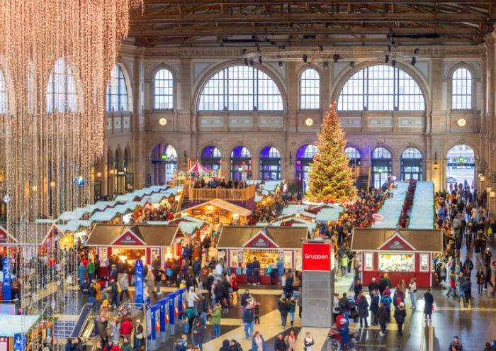 Impozantná nádražná hala najväčšej švajčiarskej stanice sa každý rok na štyri týždne premení na jedinečný Christkindlimarkt, ktorý po mnoho rokov lákal na jeden z najpôsobivejších stredobodov všetkých vianočných trhov vo Švajčiarsku – trblietavý vianočný strom pokrytý krištáľmi Swarovski.